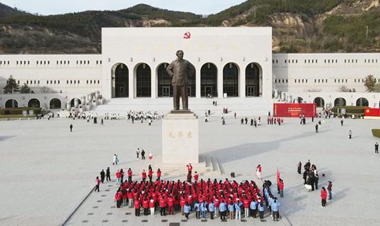 开营仪式在延安革命纪念馆前举行,鲜艳的旗帜迎风招展,象征着红色使命的传承接力。