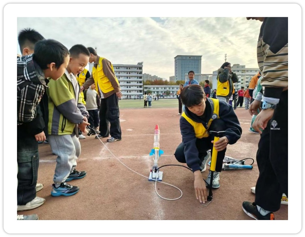 在分组实践环节,活动氛围更是推向高潮。室内手工制作区创意迸发,孩子们发挥想象搭建专属作品;烟雾炮、水火箭制作比拼现场则热闹非凡,大学生志愿者手把手指导小学生组装零件、调试参数。孩子们认真倾听、大胆尝试,在亲手操作中理解“反冲力”“气压原理”等科学知识,每完成一件作品,现场都响起阵阵欢呼,科学探索的乐趣在实践中充分彰显。
