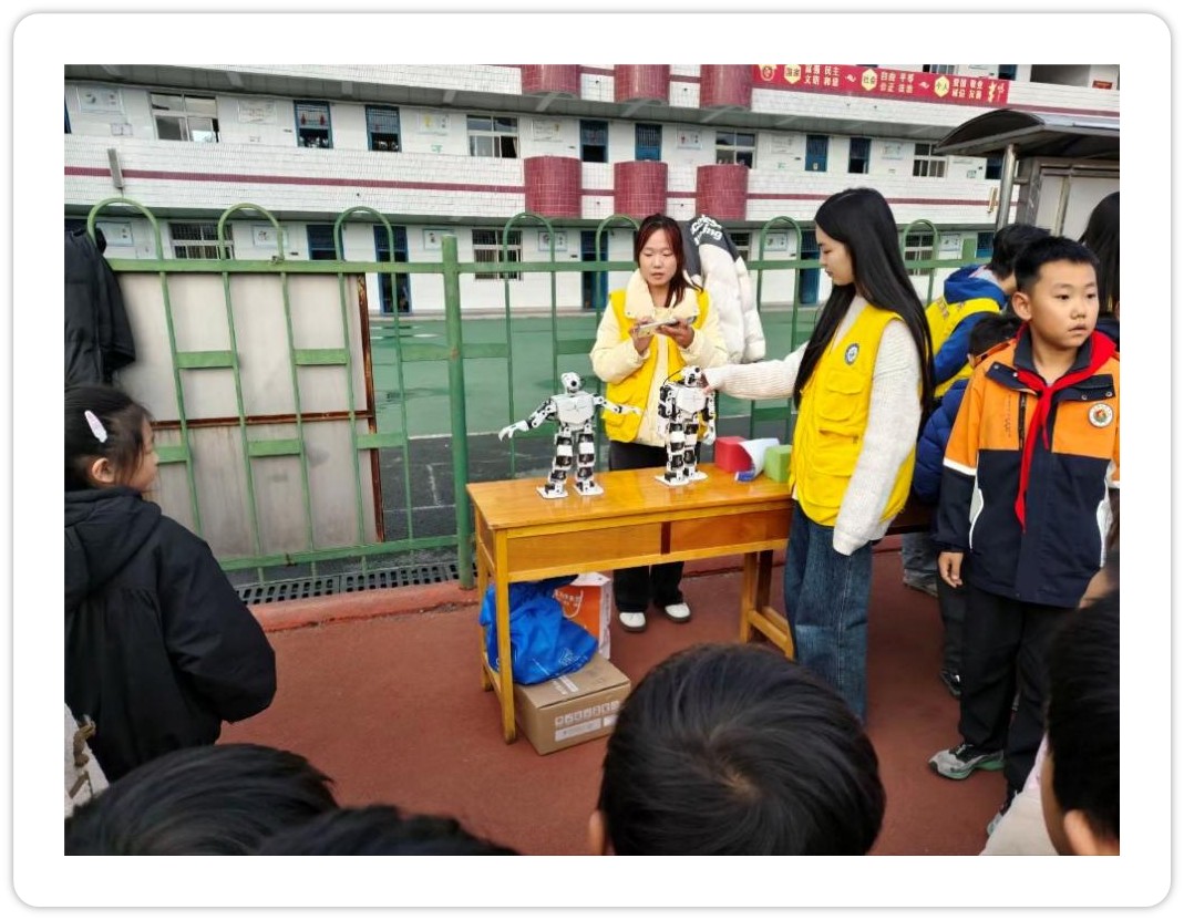 在科创作品参观环节,机械工程学院大学生团队带来的舞蹈机器人、避障小车等科创成果惊艳亮相。随着机器人灵活舞动、避障小车精准穿梭,小学生们纷纷围拢上前,好奇地观察、提问,大学生团队耐心讲解原理并演示操作,现场互动氛围热烈而浓厚。